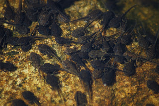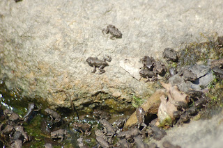 As we were approaching it in search of the bull frogs that were croaking, or possibly a turtle, little black spots on the path were jumping all over the place.