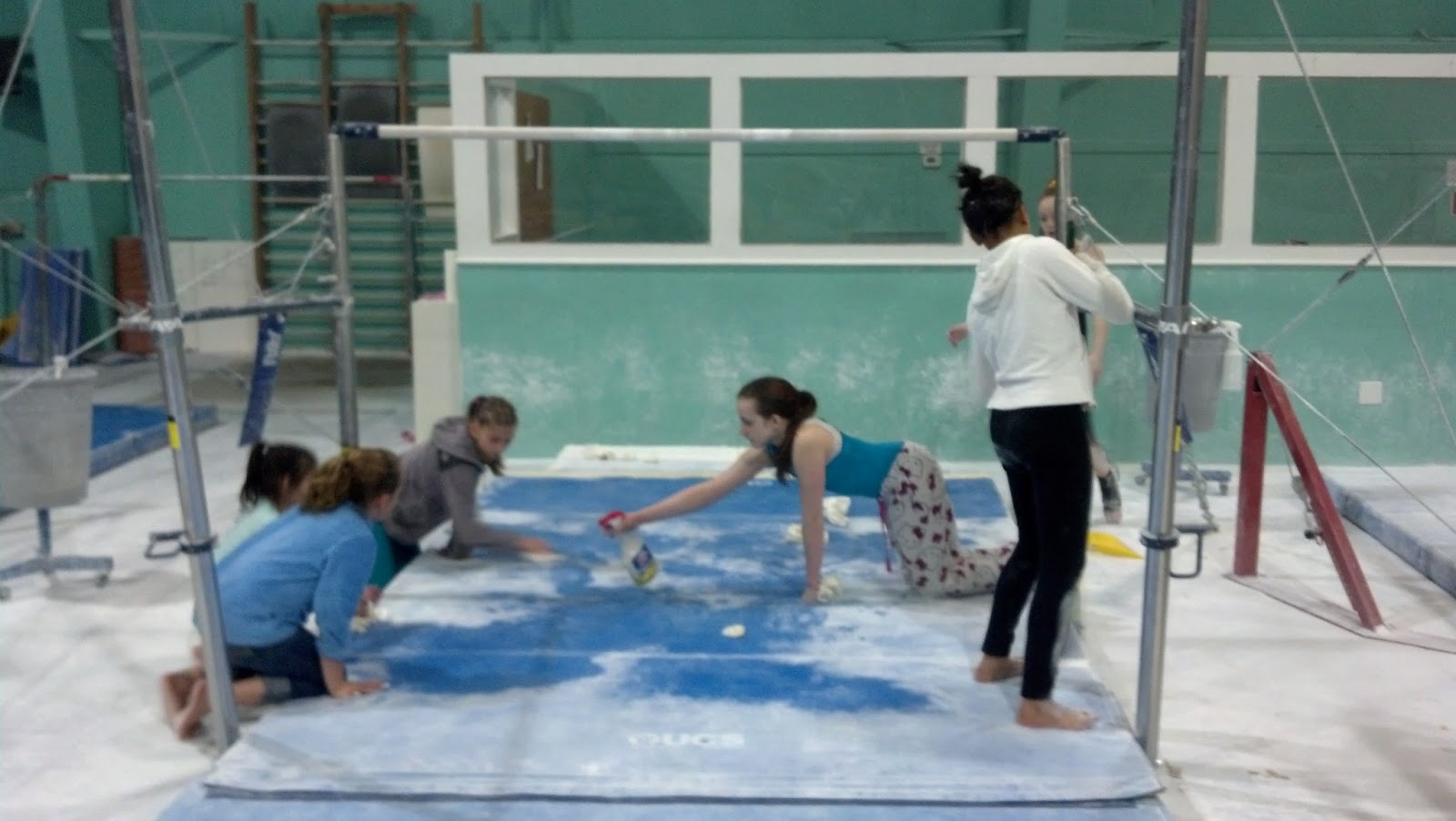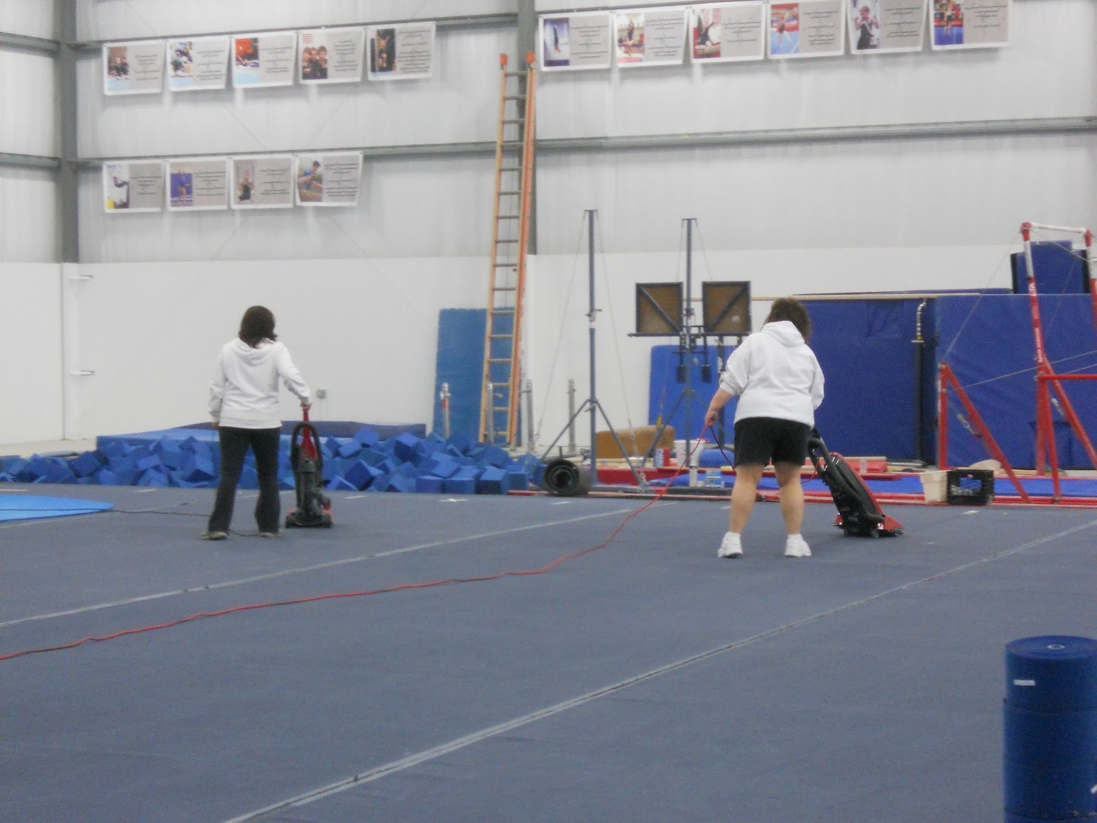 We took down the paintings and a few odds and ends things, and then it was busy busy putting the new gym together!! Did you ever wonder how they were going to get those trampolines in ground? I did!! Come to find out all you have to do is stick Matt in the hole!!