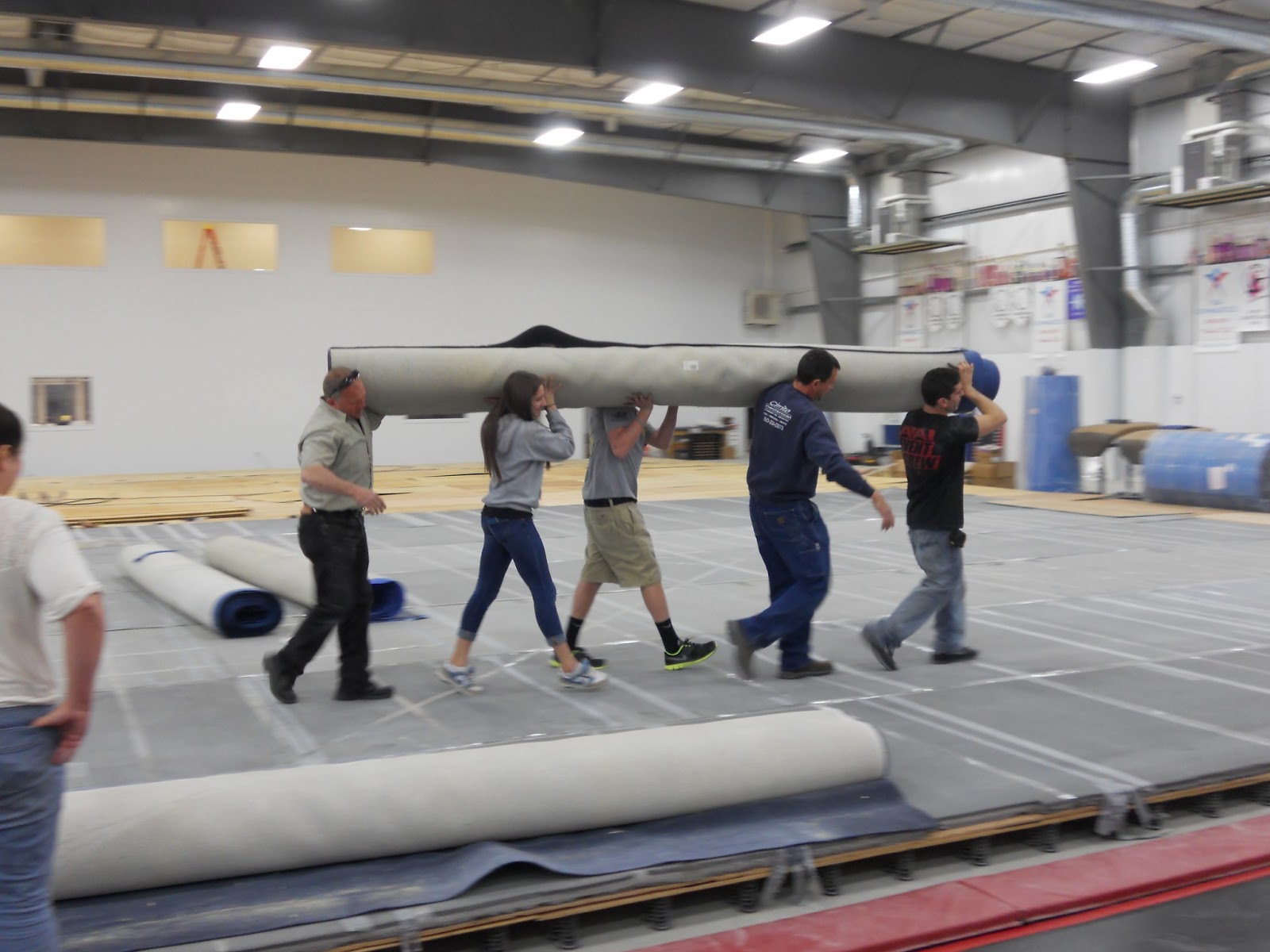 I think I got home about 10 that night, but the gym floor was assembled and the new carpet bonded foam for the cheer floor was all laid out and ready to go once we got about 20 more pieces of plywood to change the new floor system to match the existing floor the next day.