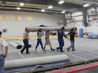 Getting the floor together was a very slow process!! Part of the reason was that we had to set up 2 full floors. One 40'x40' gymnastics floor, and one 9 panel cheer floor. Plus they were fixing the dead spots and redoing all of the velcro that holds the plywood together.
