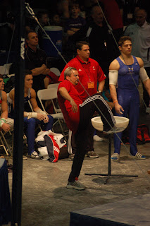Yin Alvarez cracks me up!! It's almost more fun to watch him while his athletes are competing then to watch the routine. Don't think that's possible? Check out this next series of shots, Yin is on the left jumping around while one of his athletes, Edward Mesa, is on P-Bars: