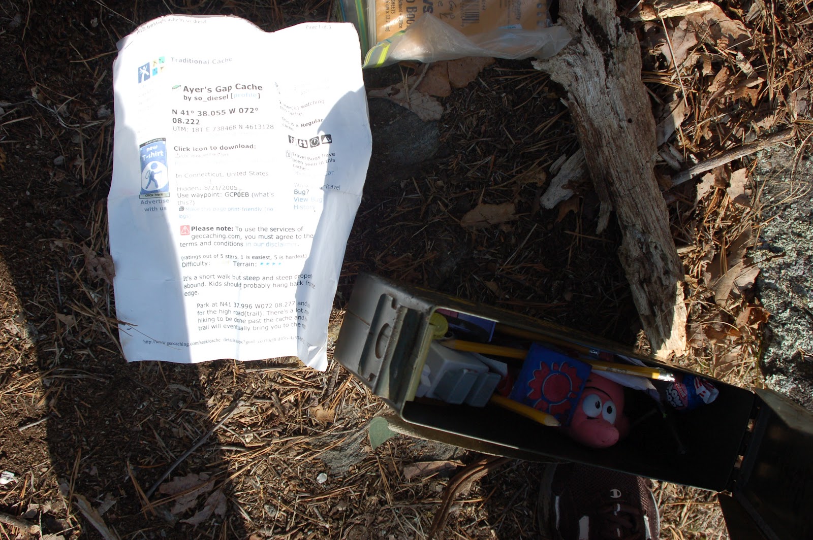 At first glance I thought it was some kids toy box of some sort, but again a rather strange place to find it. After rummaging around I found a computer print out with coordinates on it for some kind of searching game thing, I had done something similar one time with my family but that time we were looking for these things on purpose, we didn't stumble upon it on accident! I found a log book inside along with a bunch of toys and cards and random things. The entries in the log book went back to 2005 and mentioned some of the different items that people added or traded in and out