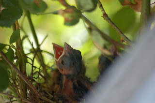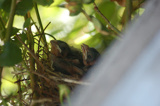 A couple weeks ago my friend Sue told me that a couple of cardinals had made a nest outside her bedroom window.  All the kids (and the cats) in the house kept a close eye on it and about a week ago 3 of the 4 eggs hatched!!  It took me a few days but I was finally able to visit to check out the nest and the baby birds :) Mama and Papa bird were around for feedings, though they were very cautious of the visitors watching from the window :) It took a little time and a little patience but finally they would come to the nest to feed the babies. Whenever mom and dad were coming the three little ones would pop up ready to eat (it was a nice little warning to me to get the camera ready), and once they were gone they would settle in and go back to sleep.