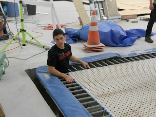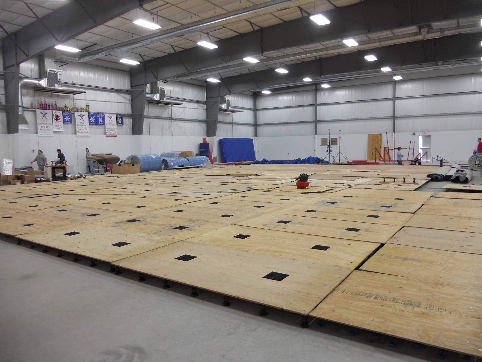 Getting the floor together was a very slow process!! Part of the reason was that we had to set up 2 full floors. One 40'x40' gymnastics floor, and one 9 panel cheer floor. Plus they were fixing the dead spots and redoing all of the velcro that holds the plywood together.