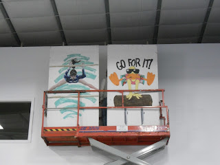 By late afternoon, there wasn't too much to do. A lot of the equipment was still piled up, the floor wasn't ready yet, just a lot of waiting and trying to find something productive to do. I decided putting up the banners and trophies would be a good way to pass the time, especially when there weren't too many obstacles to work around. The ladder I wanted to use got stolen right before I was about to use it, so long story short, they gave me a crash course in driving the lift!! No, I didn't actually crash into anything, and let the record show that I was NOT the one to put a hole in the brand new wall!! I was like a giddy little kid in a candy store though!! :)
