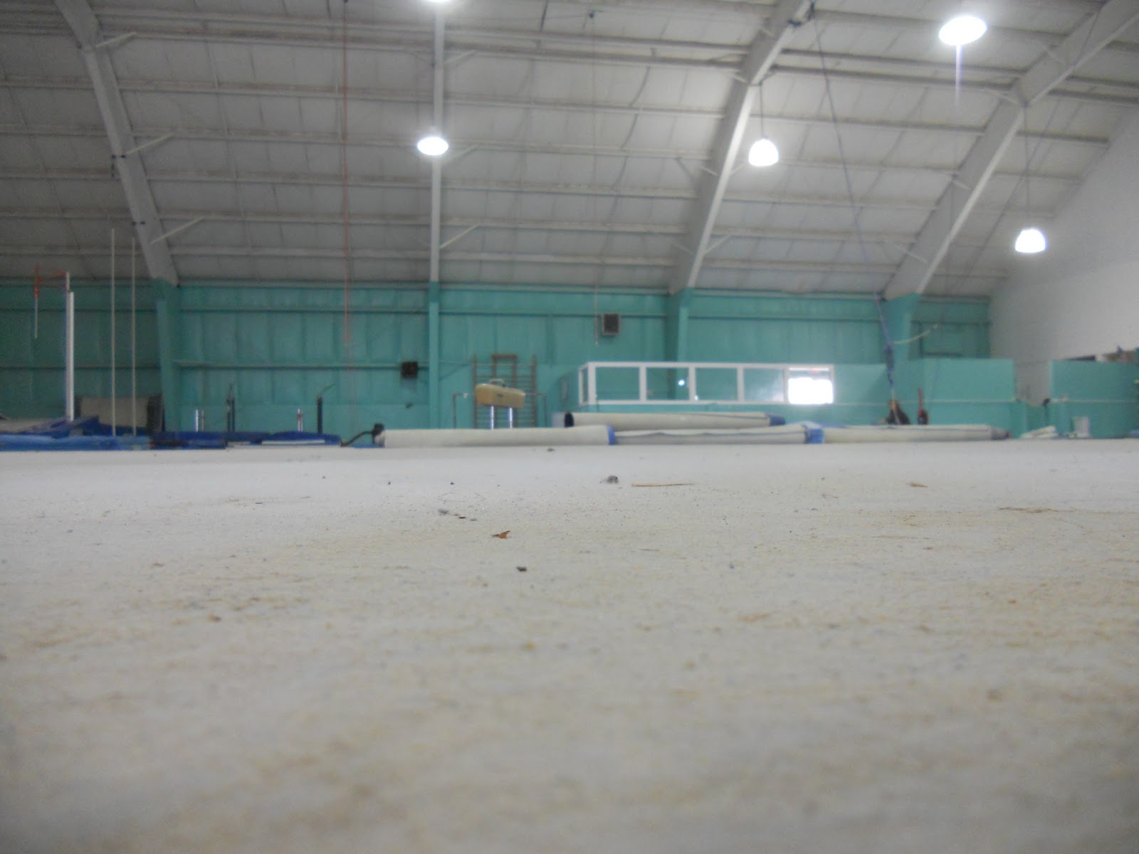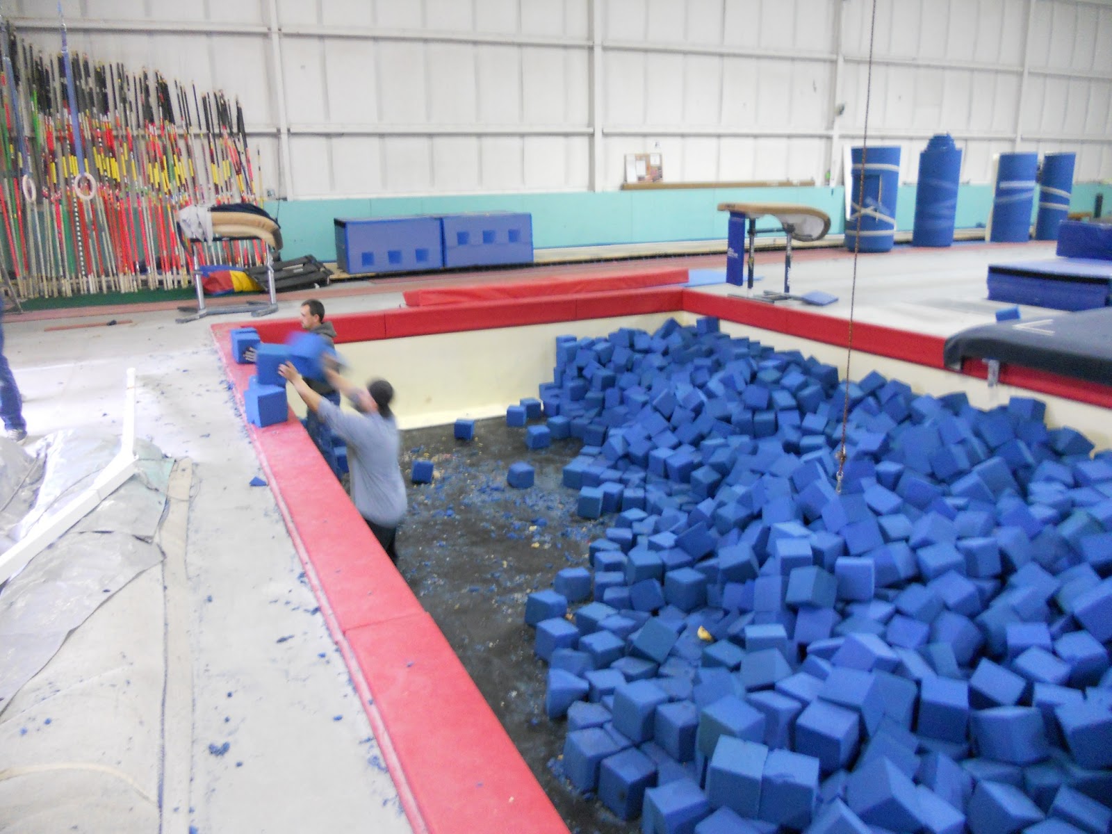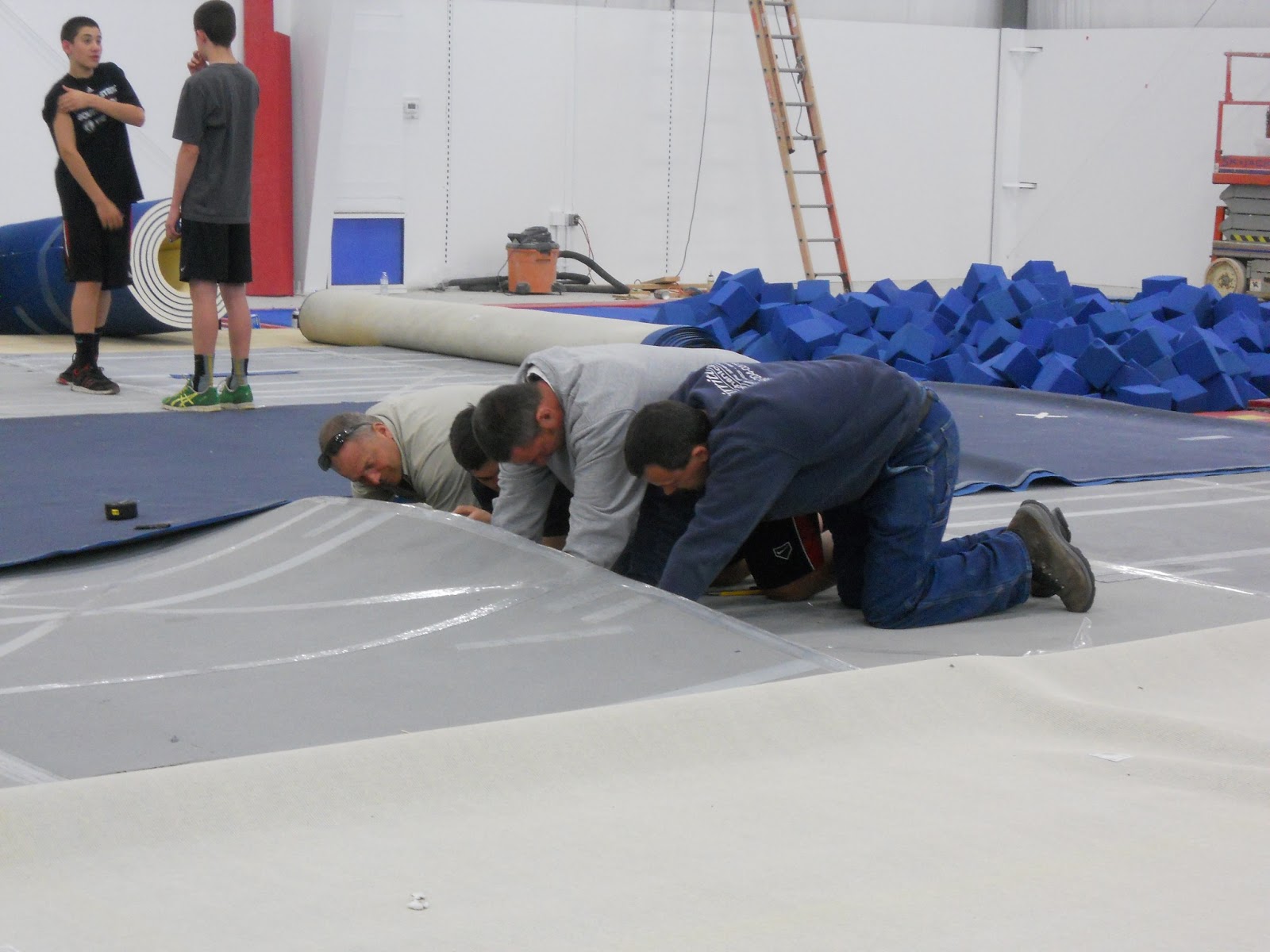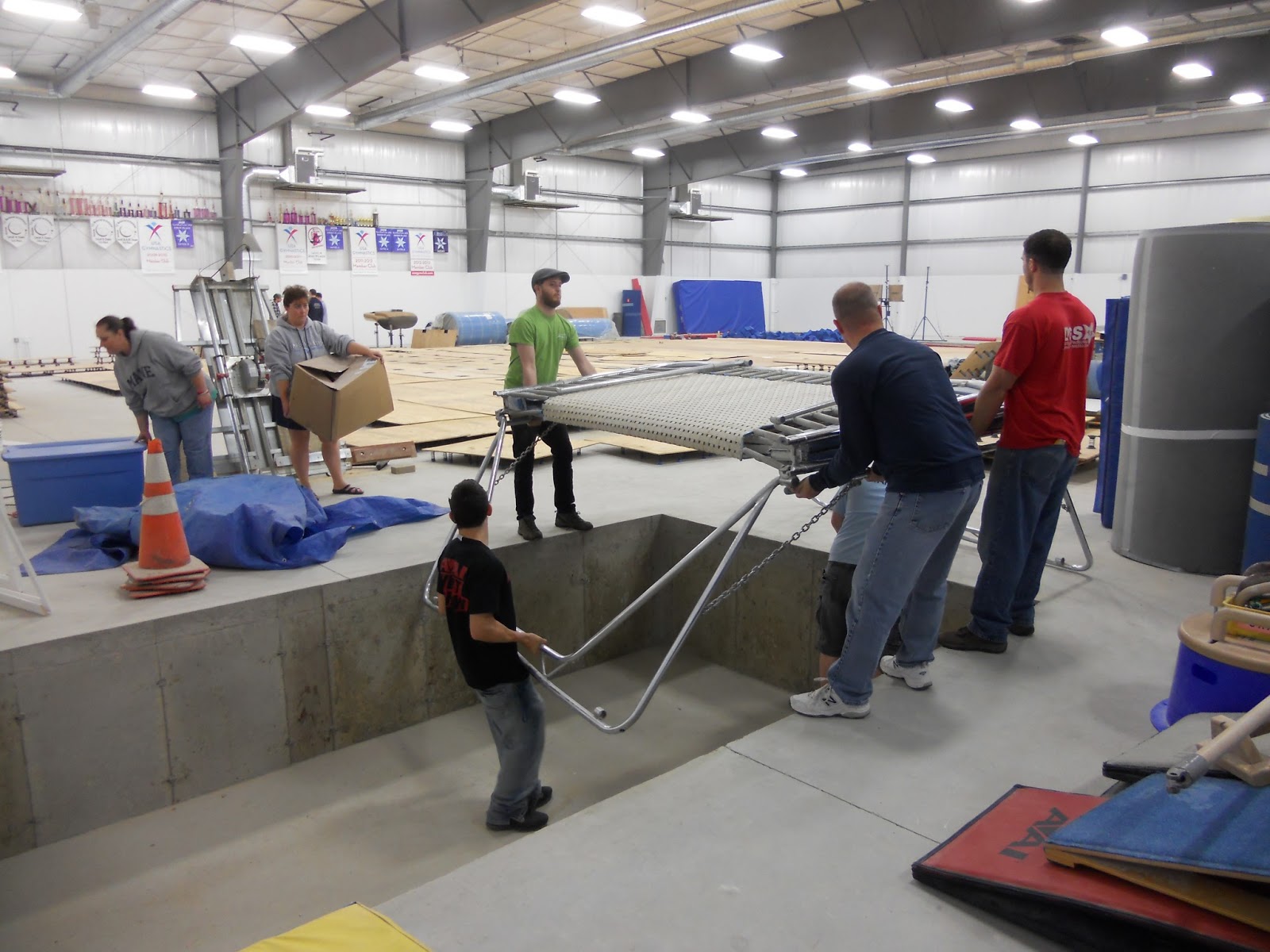 We took down the paintings and a few odds and ends things, and then it was busy busy putting the new gym together!! Did you ever wonder how they were going to get those trampolines in ground? I did!! Come to find out all you have to do is stick Matt in the hole!!
