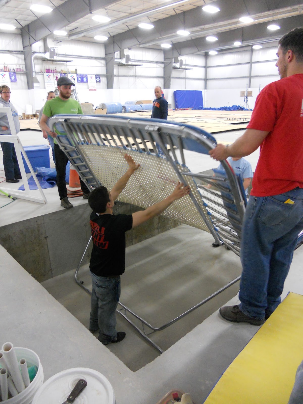 We took down the paintings and a few odds and ends things, and then it was busy busy putting the new gym together!! Did you ever wonder how they were going to get those trampolines in ground? I did!! Come to find out all you have to do is stick Matt in the hole!!