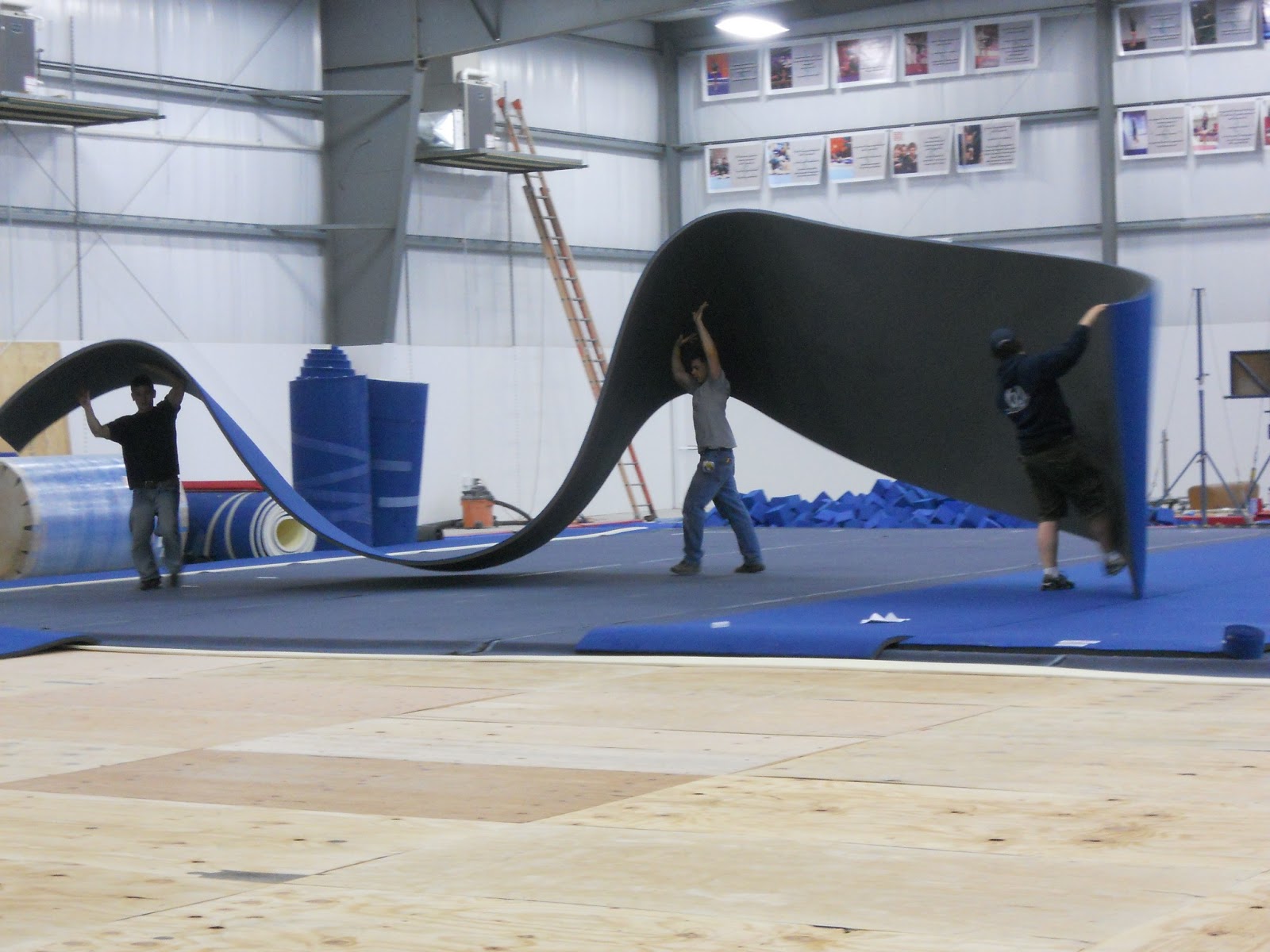 Getting the floor together was a very slow process!! Part of the reason was that we had to set up 2 full floors. One 40'x40' gymnastics floor, and one 9 panel cheer floor. Plus they were fixing the dead spots and redoing all of the velcro that holds the plywood together.
